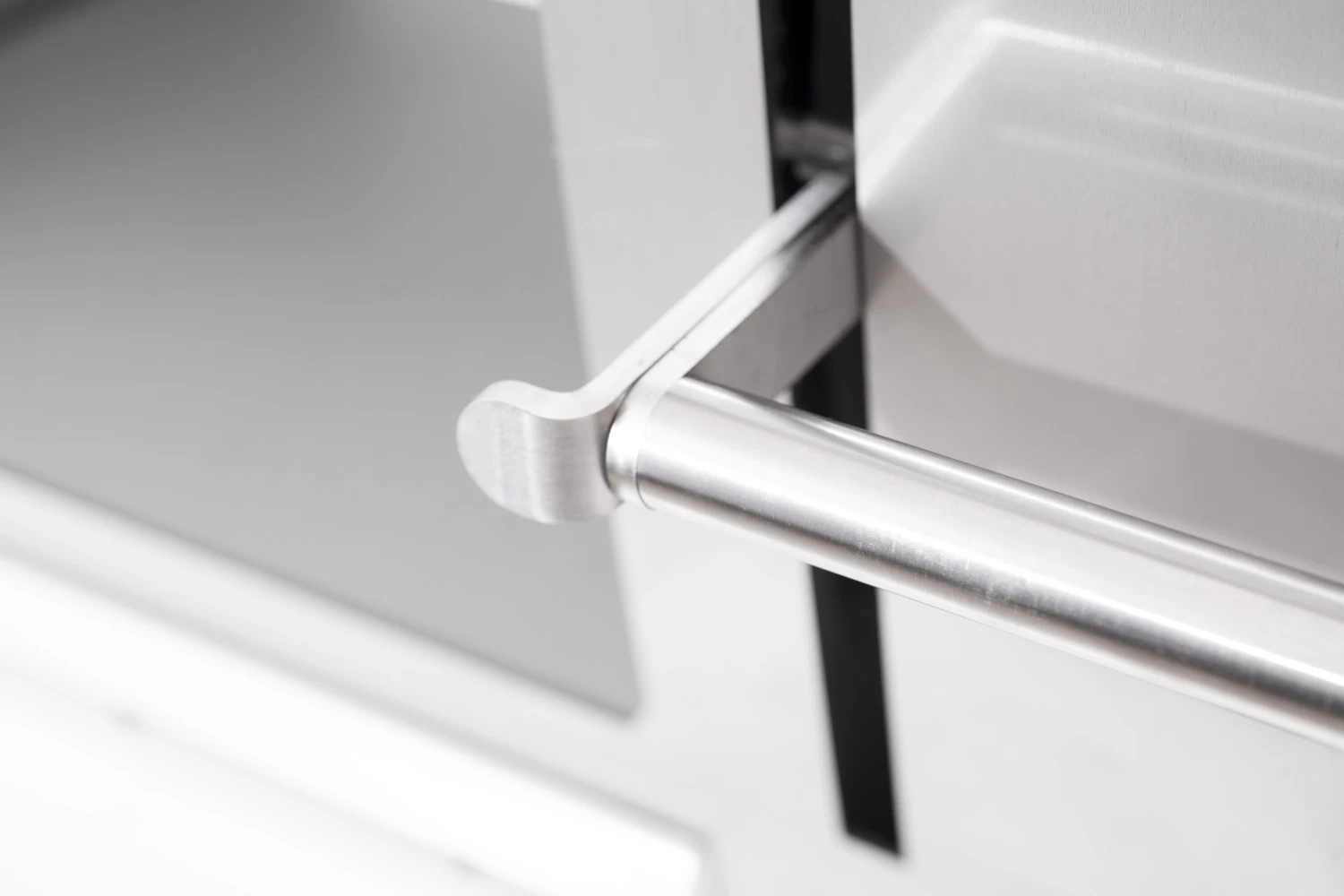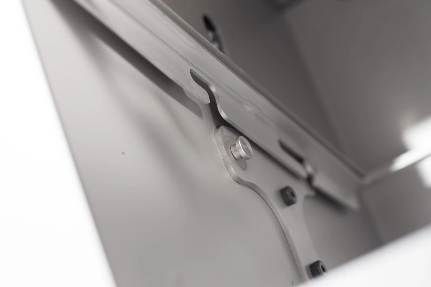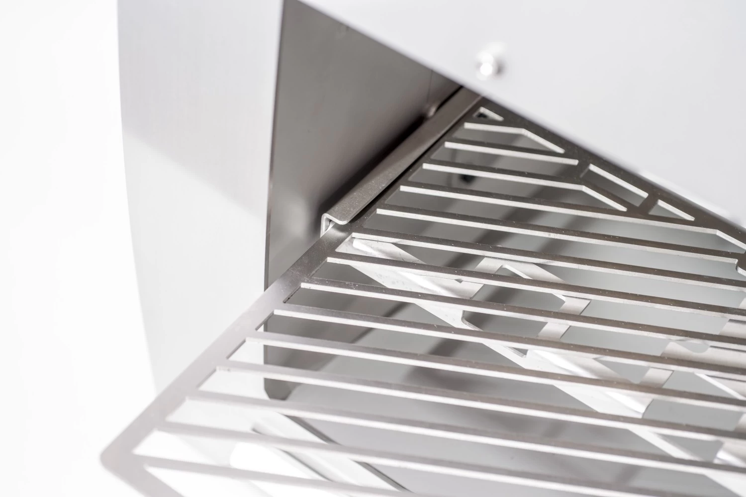 Die gesamte Konstruktion ist speziell auf die Gastronomie zugeschnitten. So ist der vollverschweißte Innenraum für strenge Hygieneauflagen gewappnet, ist leicht zu reinigen und besitzt einen automatischen Fettablauf durch einen abschüssigen Boden. Der Rostträger lässt sich werkzeugfrei entnehmen.