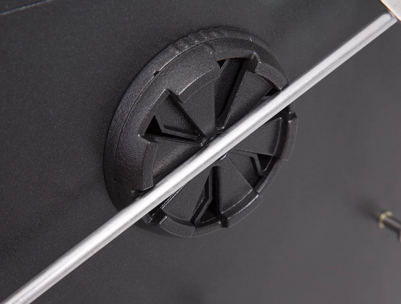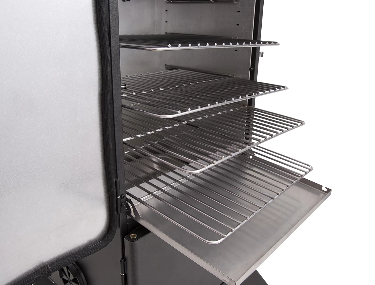 Mit seinen vier Grillrosten bietet der Smoker sagenhafte 4970 cm² Grillfläche. Der massive Holzkohlebehälter sorgt stets für genügend Hitze zur Raucherzeugung und zum Garen Ihres Grillguts. Dank doppelwandiger Stahlkonstruktion werden Hitze und Rauch effizient im Inneren des Gerätes gespeichert. Mit Hilfe der beiden stufenlos regulierbaren Zu- und Abluftregulierungen und des in der Fronttür integrierten Thermometers haben Sie die Temperatur im Inneren fest im Griff.