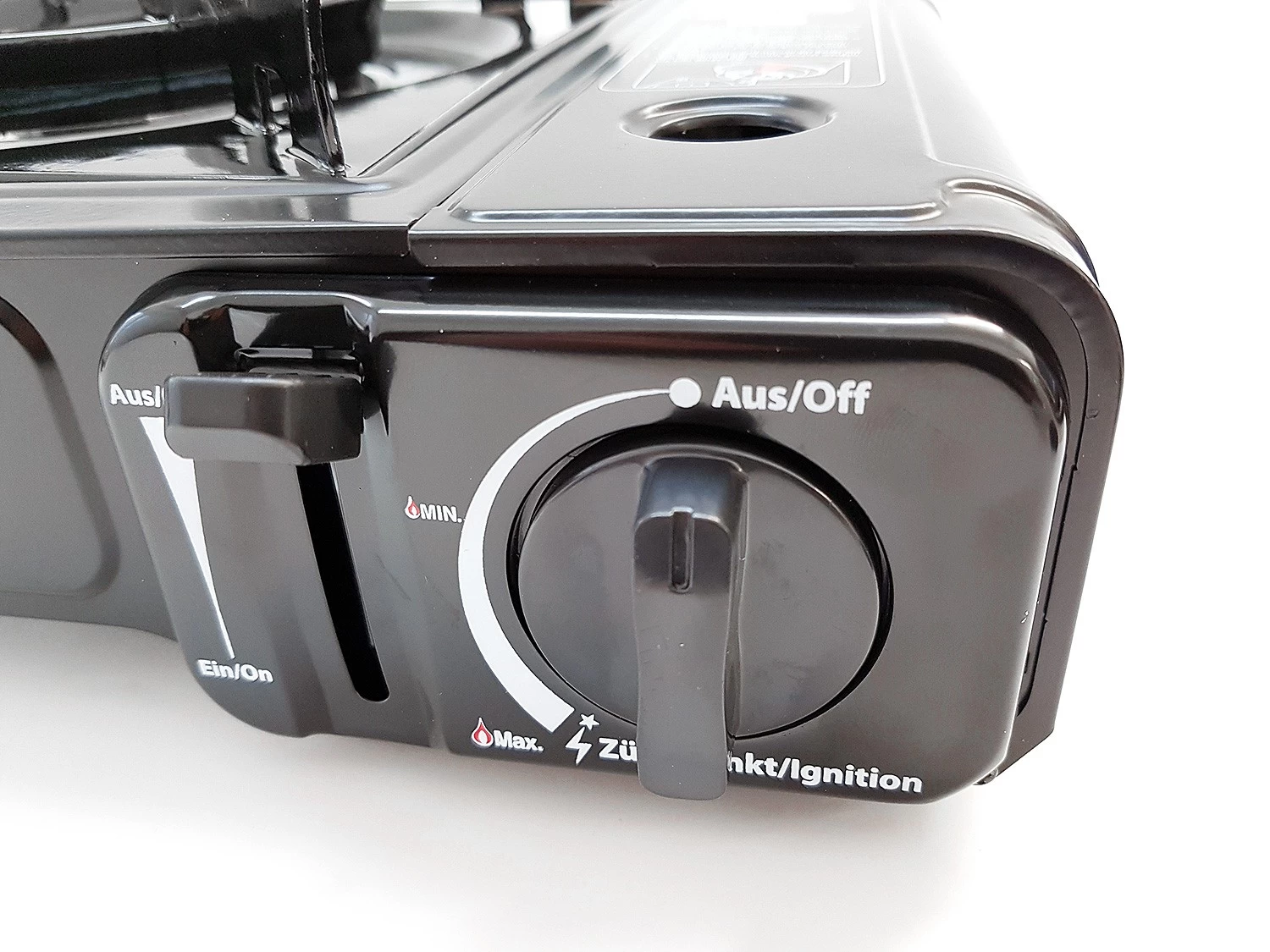 Zur Sicherheit des Campingkochers trägt auch der separate Sicherheitsschalter bei, mit dem Sie die Kartusche in der Halterung arretieren und den Gasfluss aktivieren. Ohne die Betätigung dieses Schalters kann kein Gas aus der Kartusche fließen und somit auch nicht ungewollt entweichen.