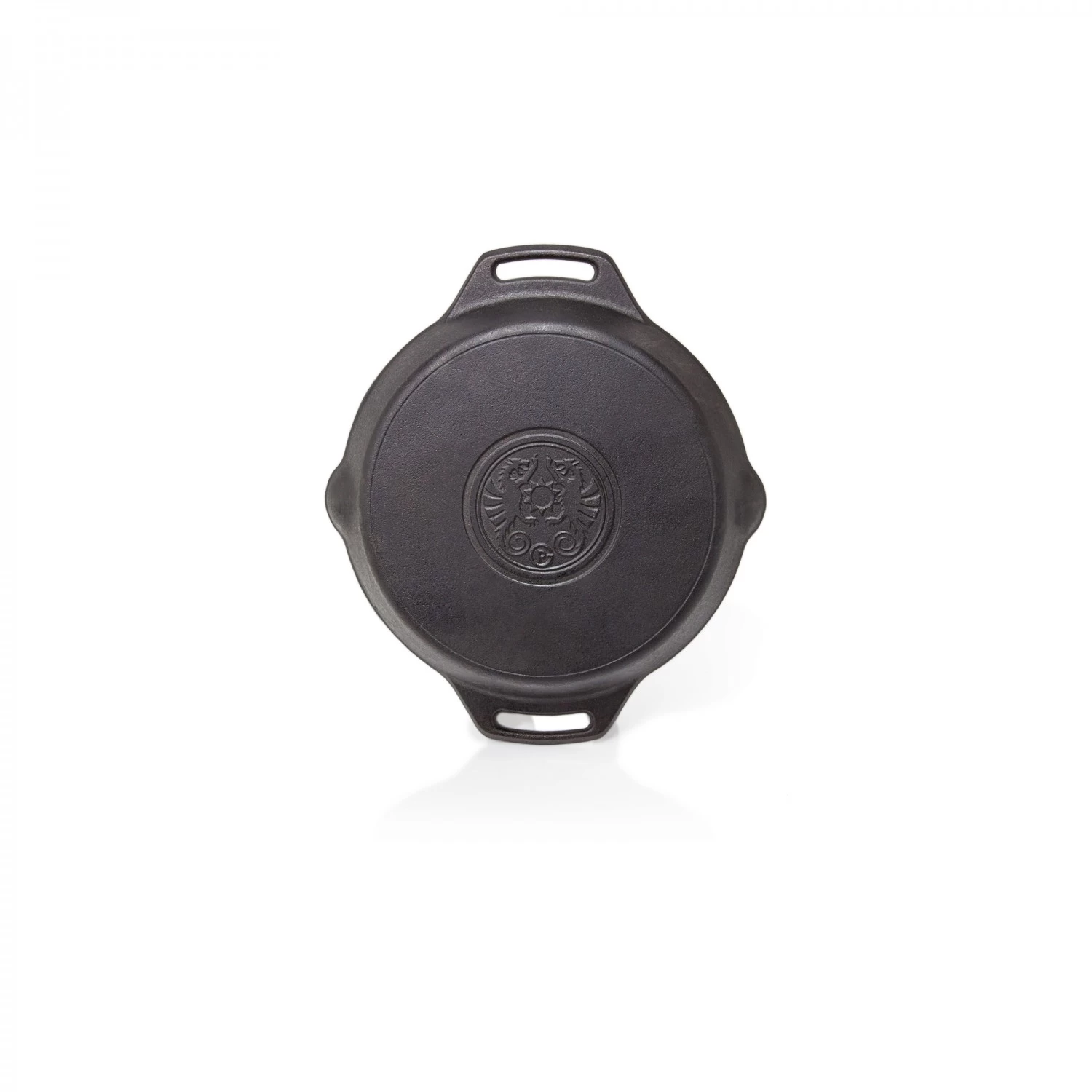 Die Gusseisenpfanne besitzt für ein sicheres Handling zwei Henkel sowie zwei Schüttnasen zum einfachen Abschütten des Inhaltes ohne Kleckern.