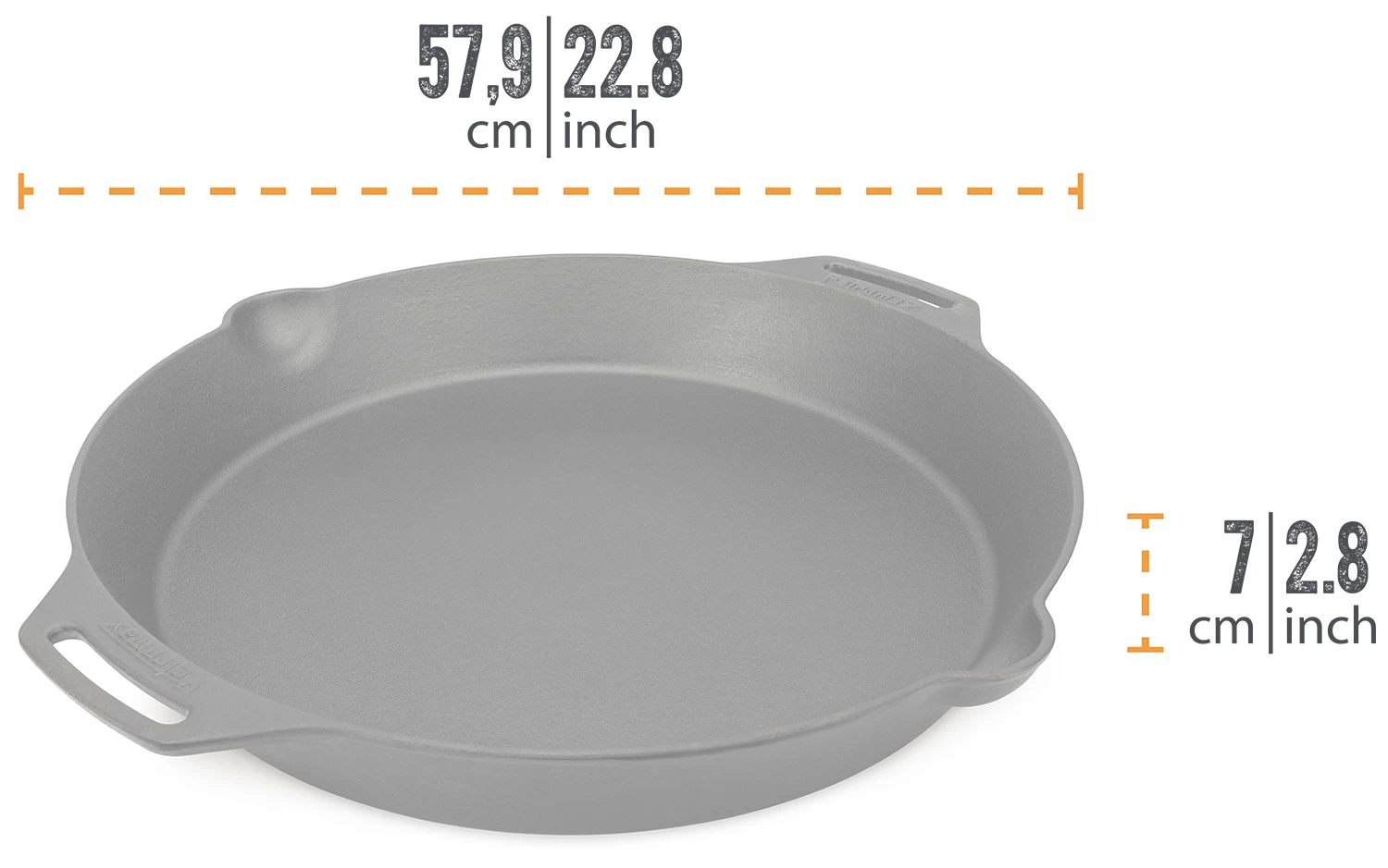 Die Gusseisenpfanne besitzt für ein sicheres Handling zwei Henkel sowie zwei Schüttnasen zum einfachen Abschütten des Inhaltes ohne Kleckern.
