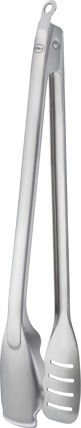 Die Rösle Premium Grillzange besitzt eine große Wendefläche, um das Grillgut sicher im Griff zu halten. Ein Zangenkopf ist mit praktischen Fettablaufschlitzen ausgestattet, der andere lässt sich auch zum Schöpfen verwenden. Dank der Verschlussautomatik kann die Zange mit nur einer Hand verschlossen und wieder geöffnet werden.